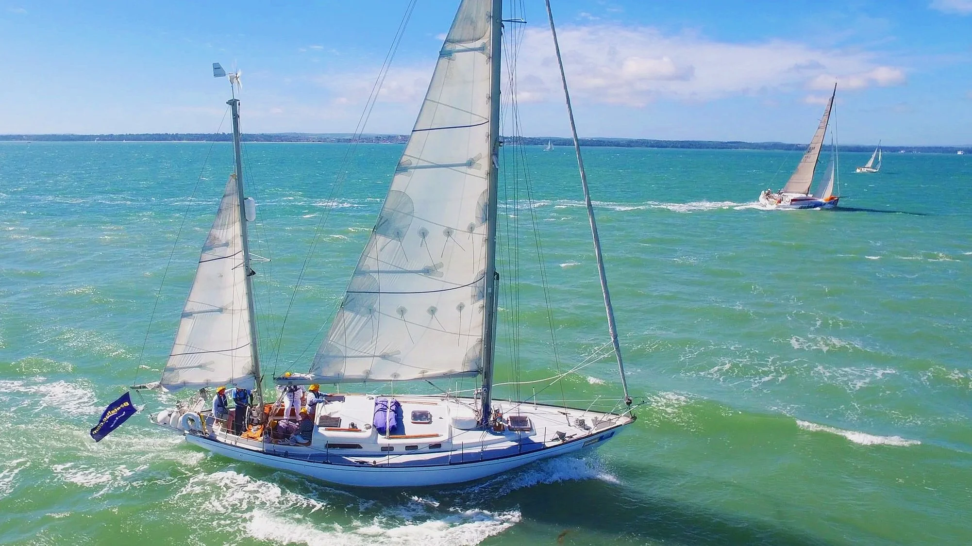 A sailboat with white sails in the Solent water, carrying several people, with a distant shoreline and other boats in the background.