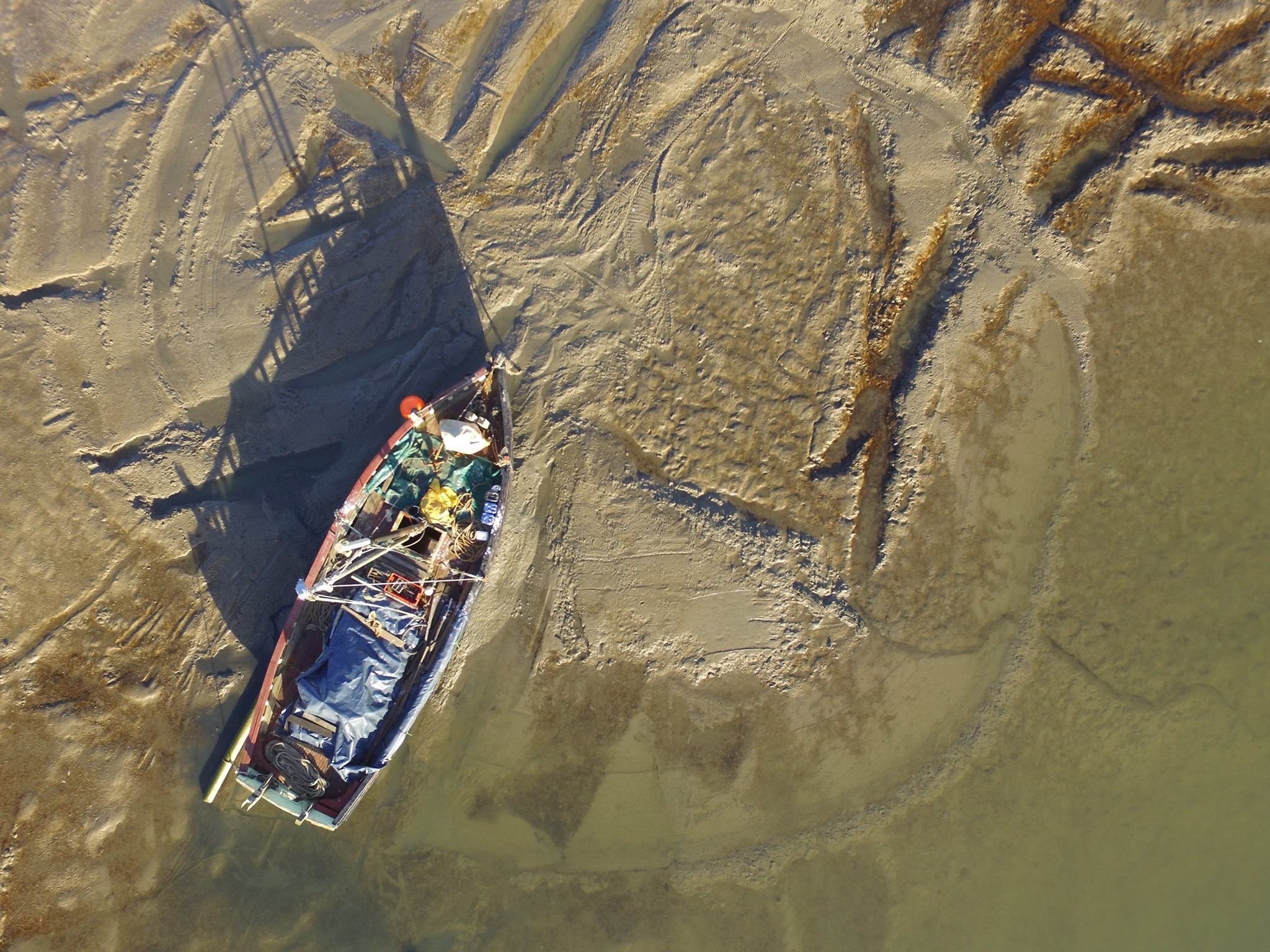 An aerial view of a boat on sandy terrain near water, with a tall shadow cast by a structure nearby.