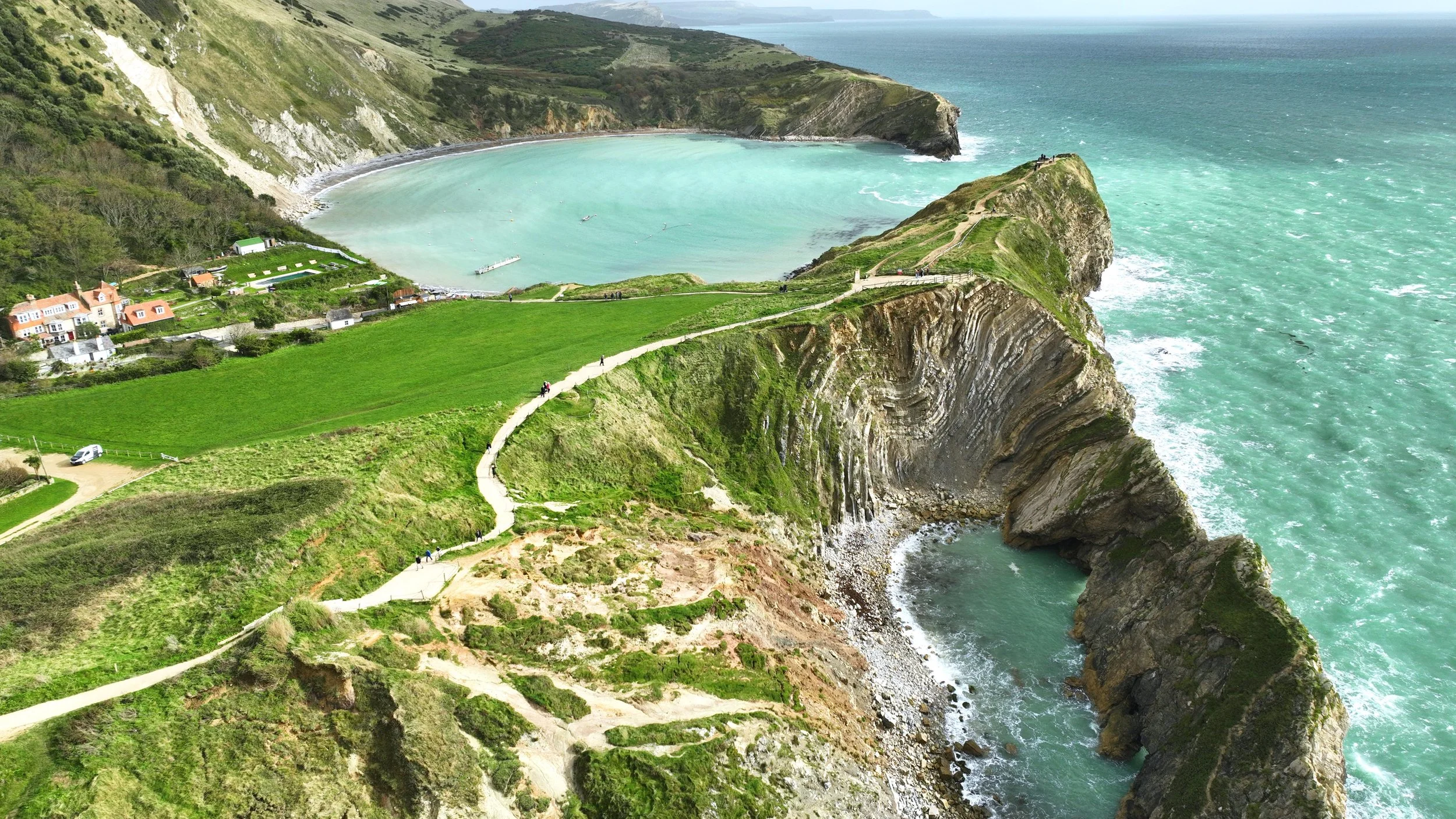 Aerial view of a coastal landscape with cliffs, a beach bay, green fields, a winding path, and houses near the shoreline