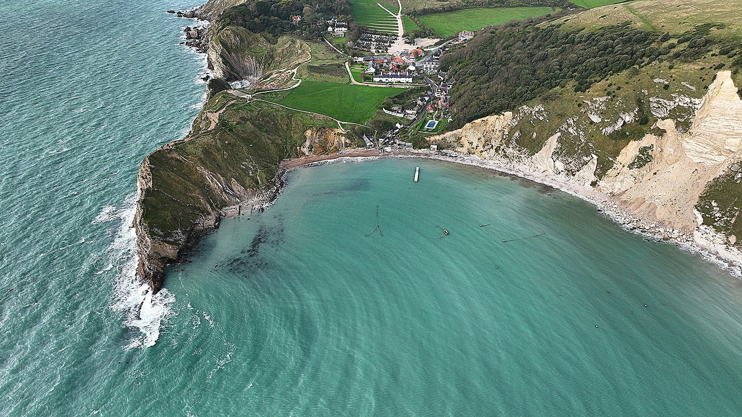 Aerial view of a coastal area with white cliffs, a small beach, and a harbor with boats. There are green fields and a town nearby.