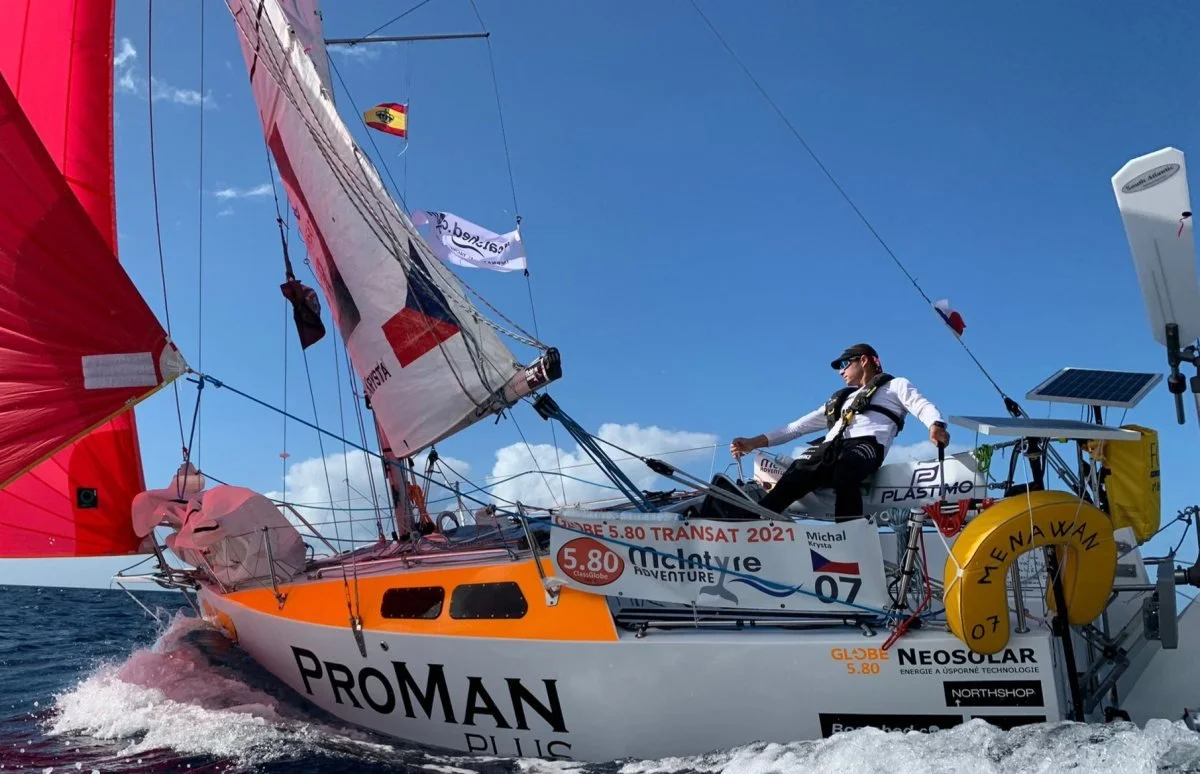 A white sailboat on the water with two people on board, under a blue sky with some clouds.